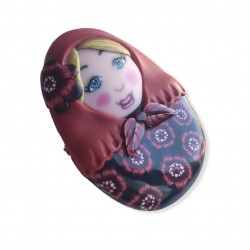 Un Bijou très original que vous ne trouverez nulle part ailleurs. Chaque poupée, bien que ressemblant à sa voisine, est un modèle unique. Le visage et les motifs sont teintés dans la masse et demandent un long travail de façonnage. La poupée est ensuite modelée, cuite, l'attache est collée et le dos travaillé avant une seconde cuisson. Le travail est fini avec différents ponçages et un polissage minutieux sur des zones choisies.