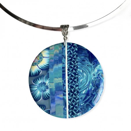 Pendentif fleuri en pâte polymère de 6cm de diamètre. Tous les motifs sont réalisés par mes soins avec la technique du millefiori pour les fleurs et celle du mokume gane pour les fonds.