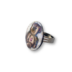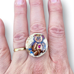 Bague artisanale en pâte polymère, motif ourson, pièce unique – bijou fait main réglable, finition brillante, disponible sur Creations-Cristalline.fr