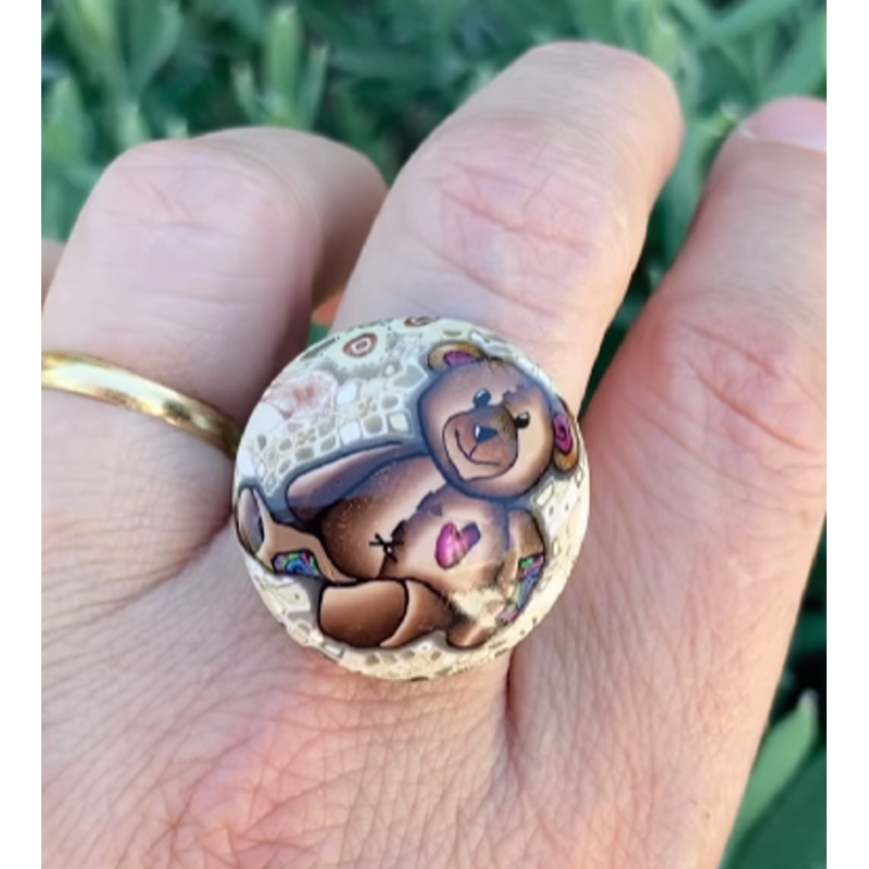 Envie d’un bijou tendre, original et entièrement fait main ? Craquez pour cette adorable bague réglable mettant en vedette un ourson en pâte polymère, minutieusement réalisé à partir d’une tranche de canne modelée à la main par mes soins. Chaque détail — du petit cœur rose à l’expression douce de l’ourson — est façonné avec minutie, poncé puis lustré pour une finition brillante et professionnelle.