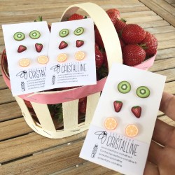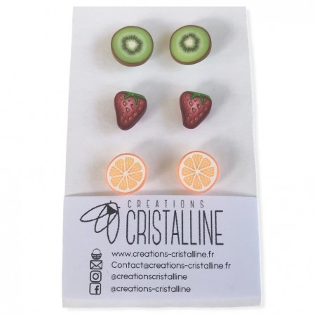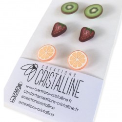 Lot de trois paires de boucles d'oreilles puces avec motifs fruités en pâte polymère : kiwi, fraise et oranges.