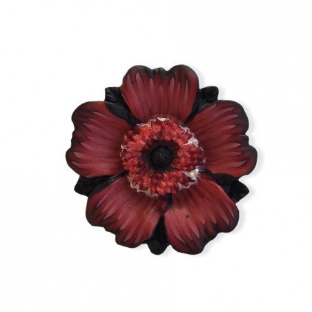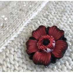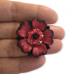 Broche rouge / noir / blanc avec fleur en relief. Pétales réalisés avec la technique du millefiori pour des effets dégradés, plissés.