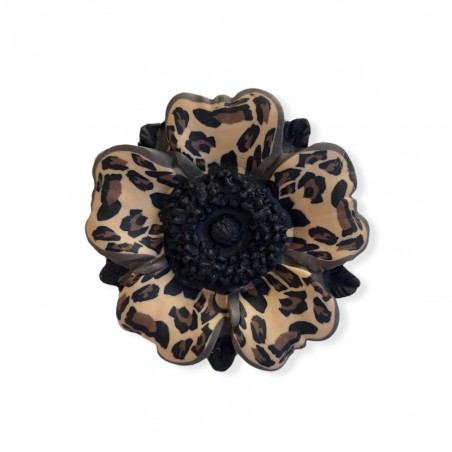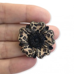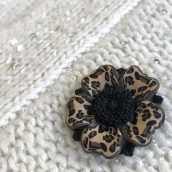 Broche rouge / noir / blanc avec fleur en relief. Pétales réalisés avec la technique du millefiori pour des motifs léopard réguliers.